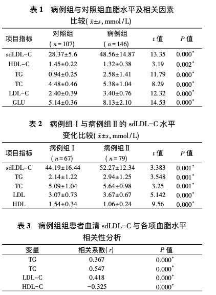 齊齊哈爾醫(yī)學(xué)院附屬第三醫(yī)院的楊秀靜等[6],將146例T2DM患(其中男85例,女61例;年齡30~70歲)中單純T2DM患者67例為病例組Ⅰ,T2DM及并發(fā)癥患者79例為病例組Ⅱ;另選擇同期健康體檢者107名作為對(duì)照組。兩組均進(jìn)行sd LDL-C、GLU、TC、TG、LDL-C、HDL-C檢測(cè)。觀察T2DM及其并發(fā)癥患者血清中sdLDL-C水平變化情況并分析其臨床應(yīng)用價(jià)值。研究結(jié)果表明,sd LDL-C在T2DM患者中升高明顯,sd LDL-C與TG、TC、LDL-C呈正相關(guān)與HDL-C呈負(fù)相關(guān)。觀察sd LDL-C的變化情況可用于預(yù)測(cè)T2DM并發(fā)癥病變發(fā)生風(fēng)險(xiǎn)。