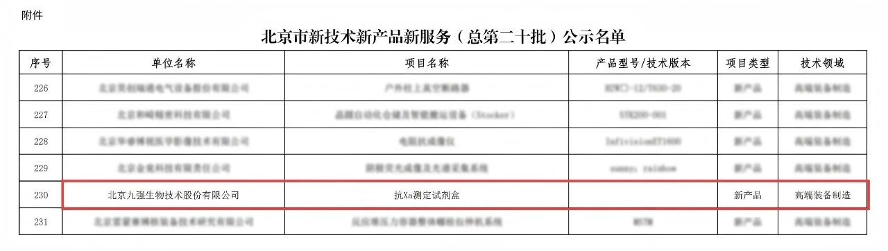 喜訊 | 九強生物抗Xa入選北京市新技術新產品新服務名單