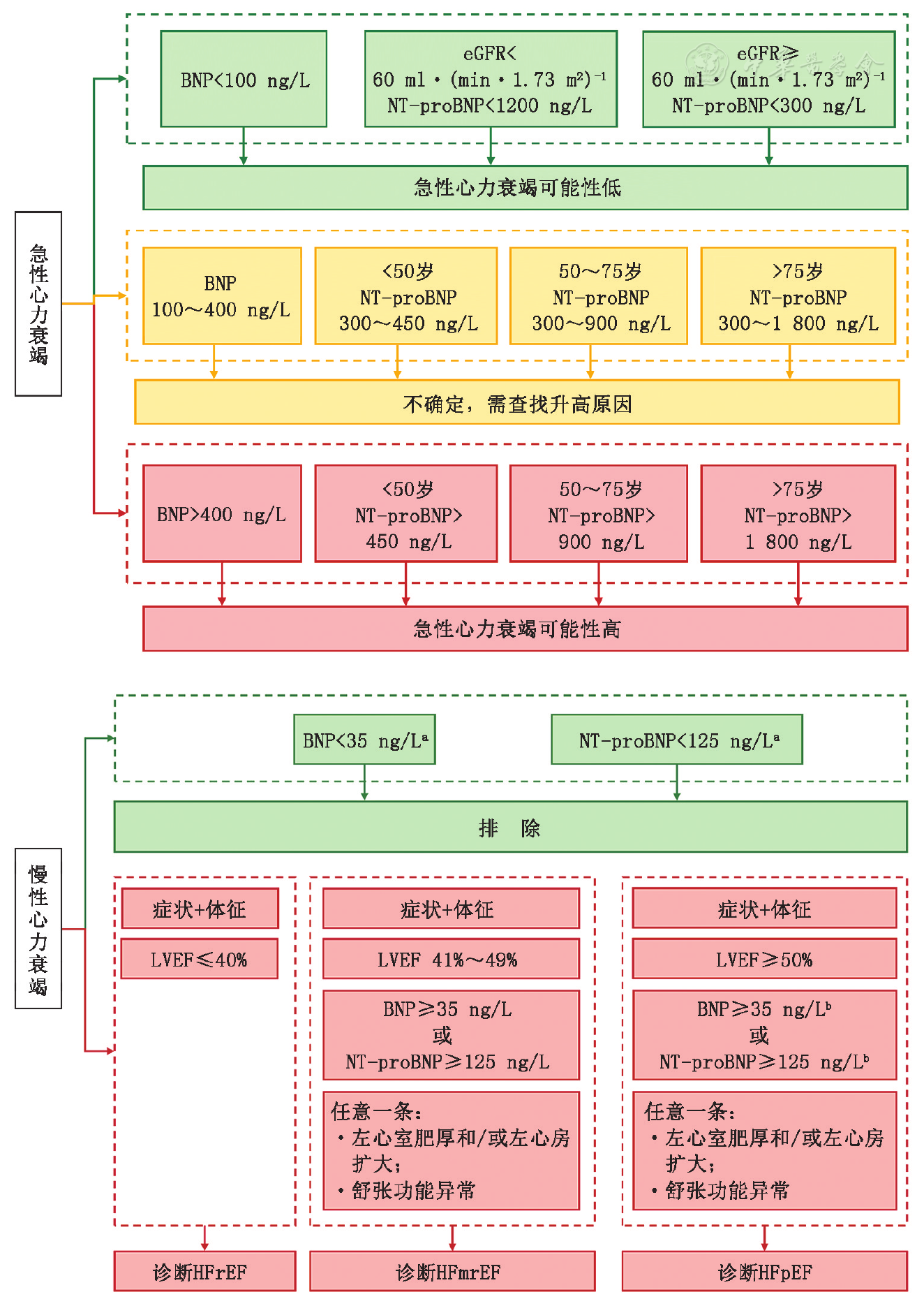 BNP和NT?proBNP均為心力衰竭診斷和鑒別診斷的**標志物,但二者檢測方法多樣,不同檢測方法結果間不能直接比較。因二者的分子結構、清除途徑和半衰期的差異,臨床應用中需注意年齡、肥胖、腎功能和藥物對其影響。對于腎功能不全[eGFR<60ml·(min·1.73m2-1]和肥胖者(BMI>30kg/m2)BNP/NT?proBNP用于排除和診斷心力衰竭時需采用校正的截斷值。